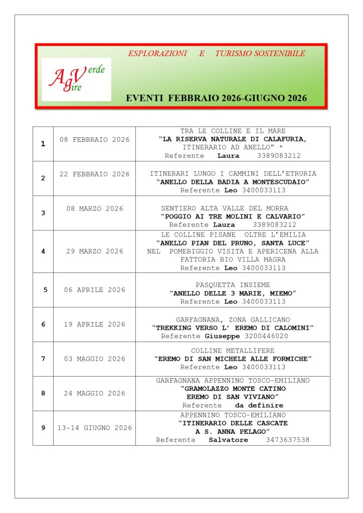 Gli interessati e gli iscritti, nei giorni precedenti alle iniziative, potranno consultare il report dell’escursione redatto dal coordinatore dell’evento con tutte le informazioni necessarie e gli iscritti direttamente sulla propria e mail.
